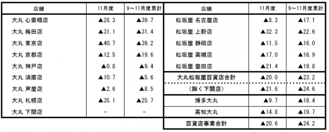 11月度の店頭売上高は、引き続き外出を控える動きやインバウンド売上げの大幅な減少が継続して、前年を下回った。既存店売上高は対前年比11.3%減、全店ベースでは12.8%減となった。商品別売上げでは、特選衣料雑貨・宝飾品が前年実績を上回ったが、紳士服・紳士雑貨・婦人服・婦人雑貨・リビング・食料品などは前年に届かなかった。