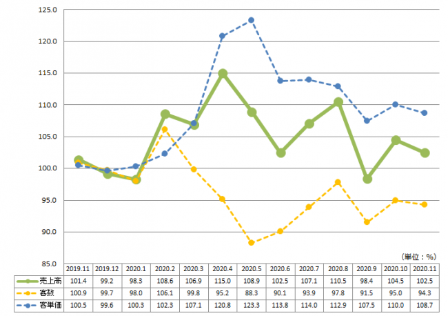 部門別では、食品507億9500万円(前年同月比8.7%増)、衣料品18億3000万円(5.0%減)、家庭用品・雑貨53億5500万円(0.1%増)、その他7億4600万円(3.4%減)となった。