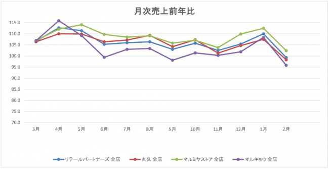 マルミヤストアは本拠地の大分県を中心に、宮崎県、鹿児島県、熊本県、福岡県で店舗展開する。マルミヤストアグループの既存店は客数92.9%、客単価108.0%で売上高は100.3%。全店ベースの売上高は102.4%。
