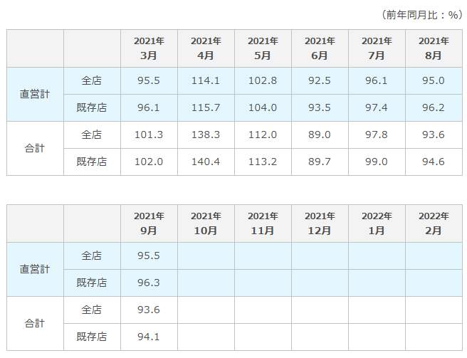 直営の全店では95.5%、テナントを含む全店ベースでは93.6%。