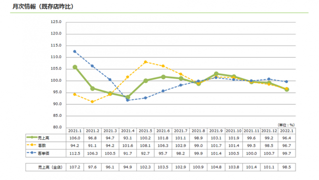(株)ライフコーポレーション(東京本社:東京都台東区、大阪本社:大阪市淀川区、岩崎高治社長)が発表した1月度の営業成績は、既存店が昨年同月比96.4%、客数96.7%、客単価99.7%と前年を下回った。