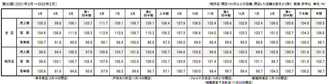 年間ベースで見ると既存店売上高は101.3%の増収。客数は102.7%、客単価が98.7%。