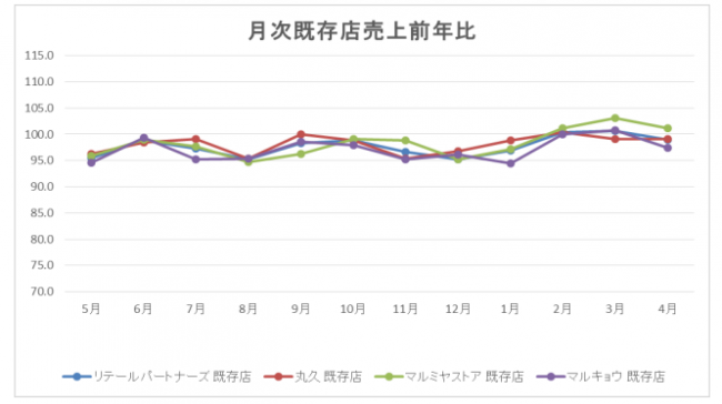 (株)リテールパートナーズ(山口県防府市、田中康男社)が4月度の営業成績を発表した。リテールパートナーズはスーパーマーケットの(株)丸久、(株)マルミヤストア、(株)マルキョウの3事業会社で構成されている。