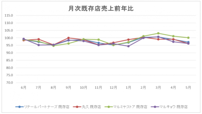 (株)リテールパートナーズ(山口県防府市、田中康男社長)が5月度の営業成績を発表した。リテールパートナーズはスーパーマーケットの(株)丸久、(株)マルミヤストア、(株)マルキョウの3事業会社で構成されている。