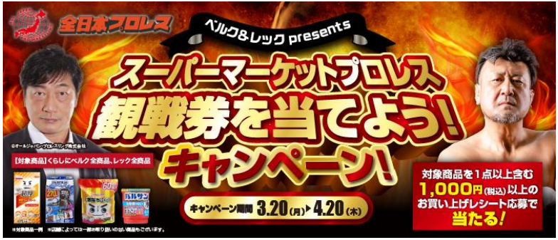 5月20日(土)に総合家庭用品メーカーのレック(株)とコラボした「ベルク&レックpresents スーパーマーケットプロレス」を開催する。その試合の観戦券が150組300名に当たるキャンペーンを3月20日から4月20日の期間、展開している。オリジナルな販促施策で面白い。