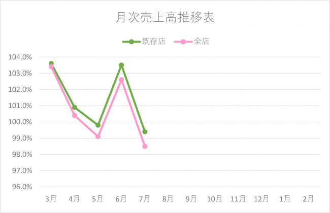 既存店売上高が99.4%、全店売上高が98.5%と、ともに前年マイナスとなった。
