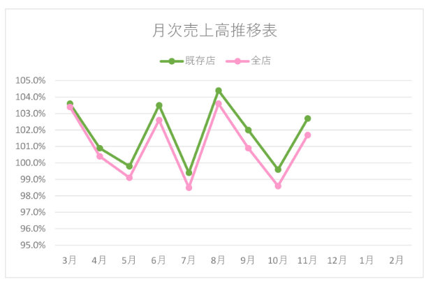 既存店売上高102.7%%、全店売上高は101.7%%と、ともに前年を超えた。