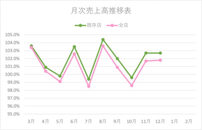 既存店売上高は102.7%%、全店売上高は101.8%と、ともに前年をクリアした。
