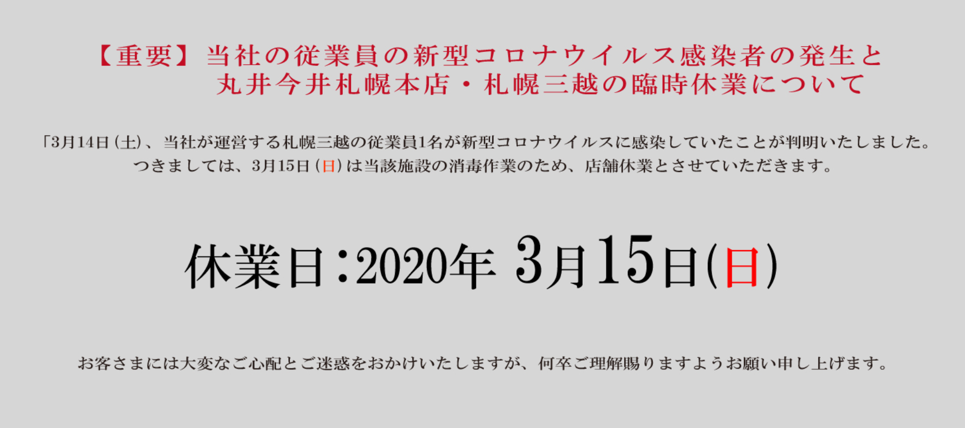 当該者は札幌丸井三越雇用の従業員で札幌三越で販売業務に従事している。3月1日(日)以降は勤務をしていないし、感染以前の勤務中にもマスクを着用し、アルコール消毒などの感染拡大防止策を施していた。また直近の海外への渡航歴はない。