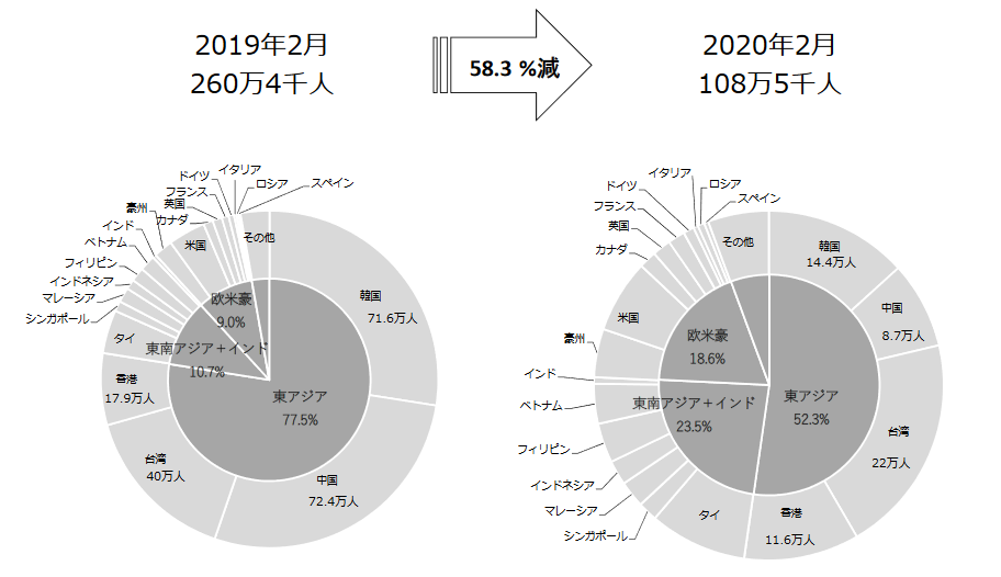 2019年は2月にあった春節が2020年は1月になったことの反動減に加えて、新型コロナウイルス感染症が大流行し、団体ツアーなどの販売が禁止されたためだ。中国市場は前年同月比87.9%減で、東アジア4市場計で71.9%減。訪日外客数が前年同月を大幅に下回った。また東南アジア市場や欧米豪市場で前年同月比20%以上減少した国があったことが、訪日外客数全体が前年同月を大幅に下回る要因となった。