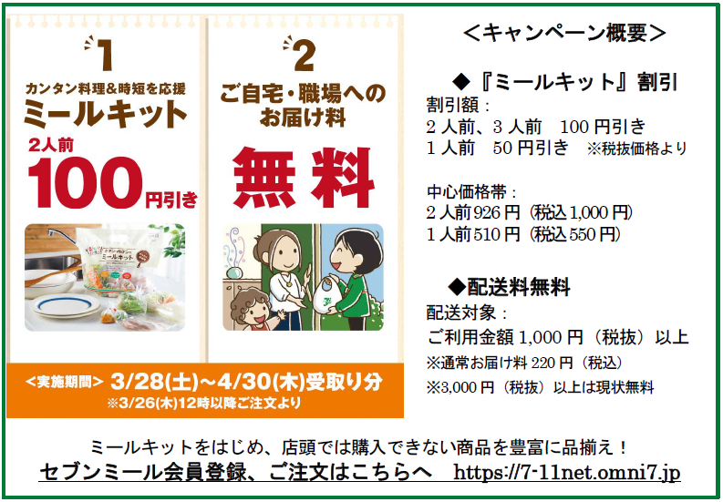 (株)セブン-イレブン・ジャパン(東京都千代田区、永松文彦社長)は 3月28日(土)~4月30日(木)の期間、セブン‐イレブンのお届けサービス「セブンミール」で取り扱う「ミールキット」の割引キャンペーン、配送料無料キャンペーンを全国のセブン‐イレブン2万0955店(2020年2月末時点)で実施する。