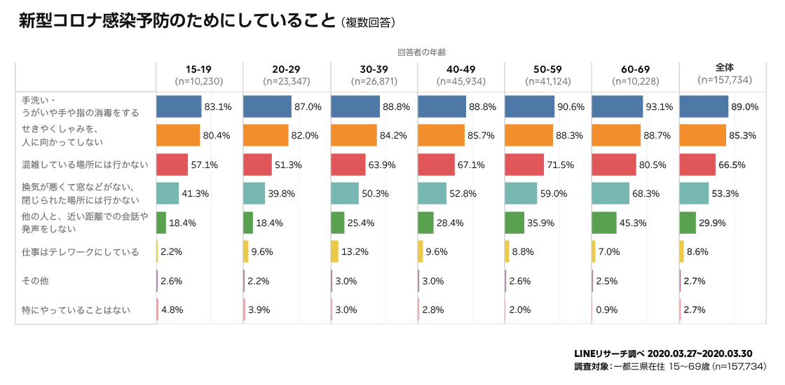 LINE(株)(東京都新宿区、出澤剛社長)は、運営するリサーチプラットフォーム「LINEリサーチ」において、3月27日(金)から30日(月)の期間、首都圏1都3県に居住する「LINEリサーチ」のモニターを対象に「新型コロナの状況把握アンケート」を実施した。約16万人の回答を得ている。その調査結果の一部が公開された。