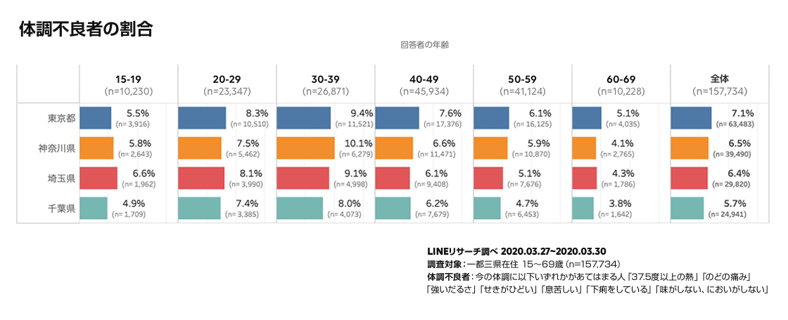新型コロナの兆候の可能性があるとされる、「37.5度以上の発熱」「喉の痛み」「強いだるさ」「咳がひどい」「息苦しい」「下痢がある」「味・においがしない」などの体調不良がある稼働を聞き、症状のいずれかにあてはまる人の割合を、エリアと年代別でグラフ化している。