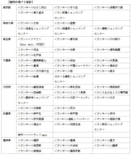 イオンnews|7都府県57施設内の専門店を臨時休業
