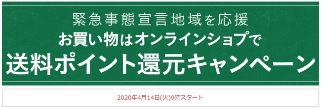 実施期間は4月14日(火) 9:00~4月27日(月) 23:59までで、現時点では、配送先が北海道、埼玉、東京、神奈川、千葉、愛知、岐阜、三重、大阪、兵庫、福岡が対象。オンラインショップの会員であることが条件で、1回の注文商品金額が3000円(税込)以上の場合とする。キャンペーンポイントの付与は、商品の出荷後、 7日前後で順次付与する。