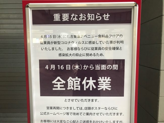 日吉東急アベニューは緊急事態宣言を受けて、4月8日(水)から1階食料品フロア以外が臨時休業となったため、無印良品もした休業。したがって感染した従業員も4月8日(水)まで勤務していたが、その後は自宅待機措置をとっていた。
