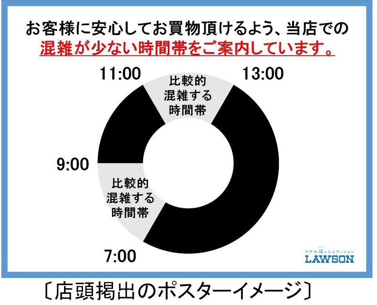 (株)ローソンは買物の「時間の分散」と「距離の分離」を促すために、店舗ごとにお客が来店する時間帯をデータで分析して、<比較的混雑している時間帯><混雑が少ない時間帯>と区別したポスターを4月22日(水)から店頭に掲出している。