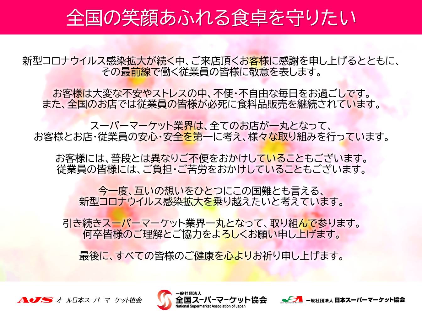 3団体は、一般社団法人日本スーパーマーケット協会(略称JSA、東京都日本橋、川野幸夫会長)、オール日本スーパーマーケット協会(略称AJS、大阪市淀川区、田尻一会長)、一般社団法人全国スーパーマーケット協会(略称NSAJ、東京都千代田区、横山清会長)。