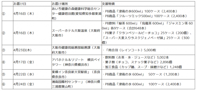 すでに4月17日(金)に、「アパホテル&リゾート 横浜ベイタワー」(神奈川県横浜市)に①飲料類(お茶・水・ジュースなど)3002本、②菓子類(チョコ、スナック菓子など)2896個、③加工食品(カップ麺、スープ・味噌汁など)1248個を、また4月22日(水)には、「東横イン奈良新大宮駅前」(奈良県奈良市)にPB商品「津南の水 600ml」50ケース(1200本)を、4月24日(金)には「湘南国際村センター」(神奈川県三浦郡葉山町)にPB商品「津南の水 600ml」100ケース(2400本)を寄贈している。