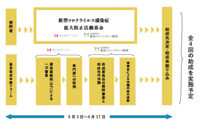 「新型コロナウイルス感染症:拡大防止活動基金」は、同基金の有志の会が主体となり、最前線で闘う医療従事者や感染拡大防止活動を行うNPOや団体に対して助成するために4月3日(金)に設立された。4月30日(木)11時30分までに、1万2246人から総額2億5646万4000円の寄付が寄せられた。同基金では全4期で助成を計画し、すでに第1期分を4月17日(金)までに10団体へ総額4629万7200円の助成を行っている。