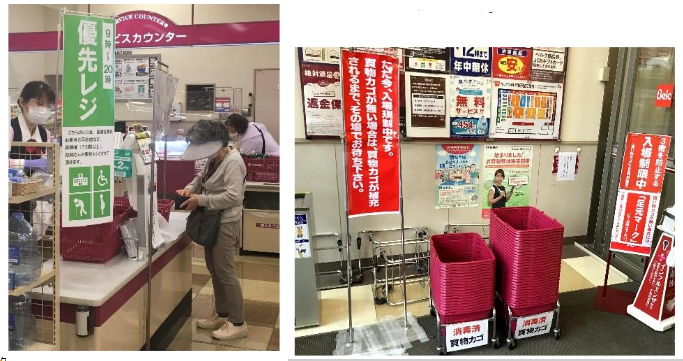 また店内の混雑の状況によって入場規制を行っているが、その対策の一環として、一部の店舗で、店舗出入口に設置している買物カゴの数を制限することで店内への入場者数を規制する。買物カゴがない場合は補充されるまでお客を待機させる。これはアメリカではコロナ感染予防対策として、繁盛店で採用されている手法だ。
