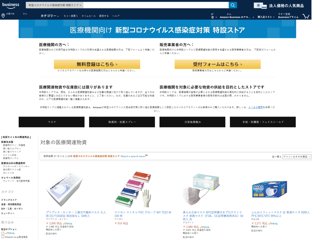 アマゾンジャパン合同会社(東京都目黒区、ジャスパーチャン社長)は、5月20日(水)、法人向けの購買専用サイト「Amazonビジネス」において、医療機関を対象とした「新型コロナウイルス感染症対策 特設ストア」(http://www.amazon.co.jp/covid-19)を開設した。