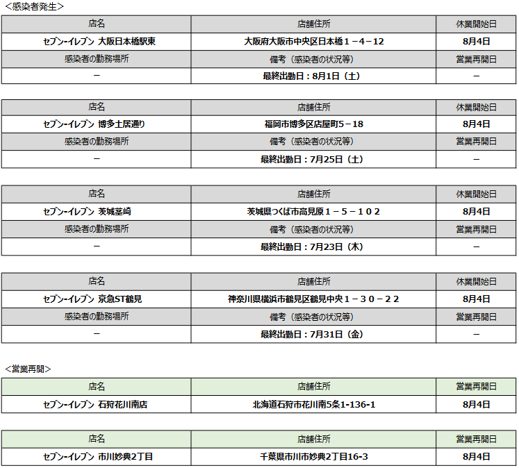 (株)セブン-イレブンで感染者が発生したのは大阪日本橋駅東店(大阪市中央区)、博多土居通り店(福岡市博多区)、茨城茎崎店(茨城県つくば市)、京急ST店(横浜市鶴見区)の4店舗。一方感染者発生店舗の石狩花川南店(北海道石狩市)、市川妙典店(千葉県市川市)は4日に営業を再開している。