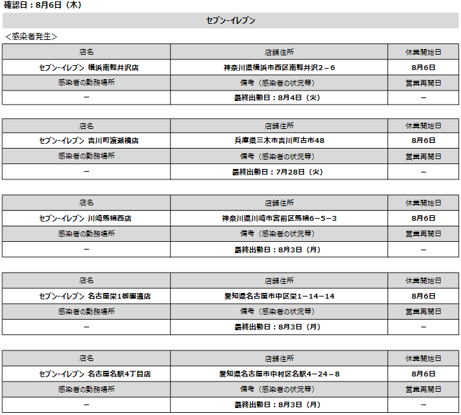 (株)セブン-イレブン・ジャパンで感染者が確認されたのは、横浜南軽井沢店(横浜市西区)、吉川町渡瀬橋店(兵庫県三木市)、川崎馬絹西店(神奈川県川崎市)、名古屋栄1御園通店(名古屋市中区)、名古屋名駅4丁目店(名古屋市中村区)の5店舗5名。