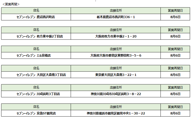 一方で6日にセブン-イレブン6店舗が営業を再開している。