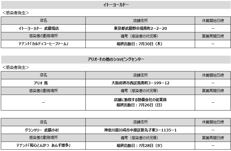 (株)イトーヨーカ堂では、イトーヨーカドー武蔵境店(東京都武蔵野市)内のテナント「カルディコーヒーファーム」従業員、アリオ鳳(大阪府堺市)の店舗に勤務する警備会社従業員、グランツリー武蔵小杉(神奈川県川崎市)テナント「和心とんかつ あんず博多」従業員の、3店舗3名。