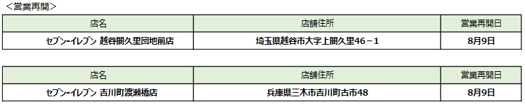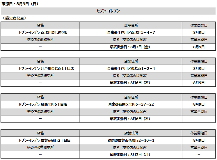 8月9日(日)に感染者発生が判明したのは、セブン-イレブン4店舗。また感染者発生によって臨時休業していたセブン-イレブン2店舗が営業を再開している。