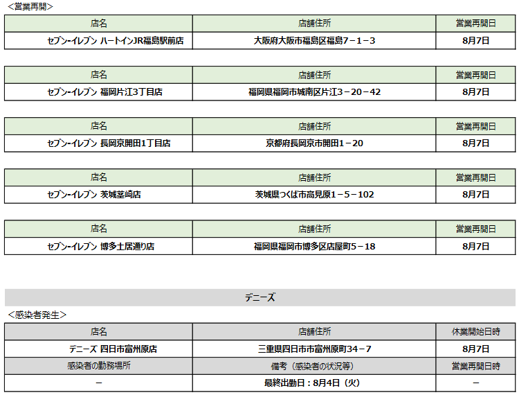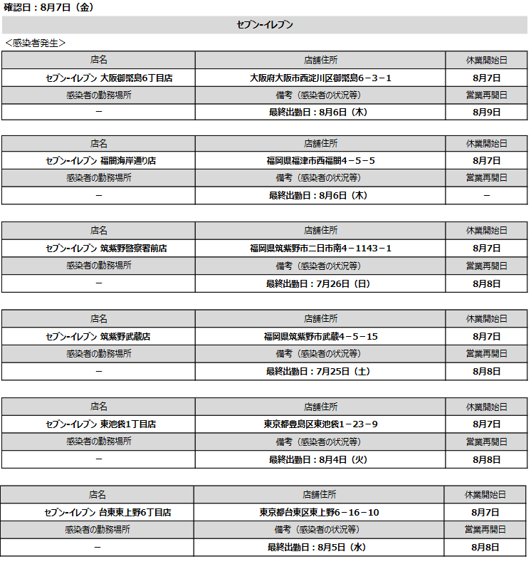 8月7日(金)に判明したのは、セブン-イレブン6店舗、デニーズ1店舗。また感染者発生によって臨時休業していたセブン-イレブン5店舗が営業を再開している。