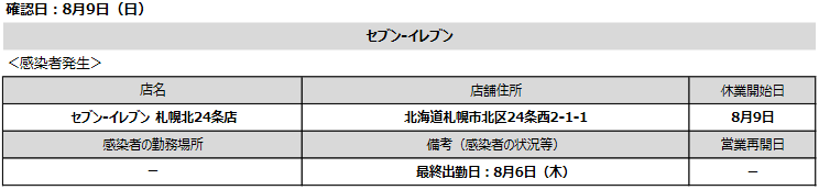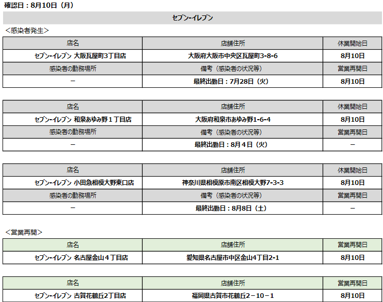 8月10日(月・祝)に感染者発生が判明したのは、セブン-イレブン3店舗。また感染者発生によって臨時休業していたセブン-イレブン2店舗が営業を再開している。