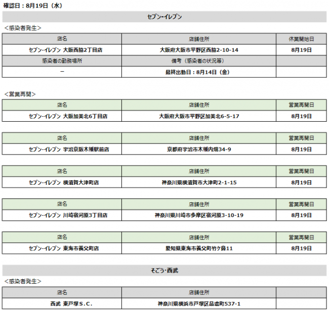 (株)セブン&アイ・ホールディングス(東京都千代田区、井阪隆一社長)が8月20日(木)、新型コロナウイルス感染者の発生が19日(金)に確認されたグループ企業店舗を発表した。