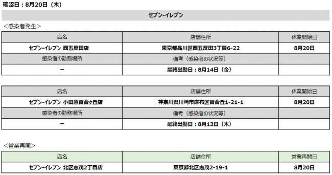 流通スーパーニュース > 新型コロナ > セブン&アイnews|8/21コロナ感染発表はセブン-イレブン2店舗のみ セブン&アイnews|8/21コロナ感染発表はセブン-イレブン2店舗のみ 新型コロナ / 2020年08月24日 ツイート (株)セブン&アイ・ホールディングス(東京都千代田区、井阪隆一社長)が8月21日(金) 、新型コロナウイルス感染が20日(木)に確認されたグループ企業店舗を発表した。 20日に確認されたのは、セブン‐イレブン西五反田店(東京都品川区西五反田3丁目6‐22)とセブン‐イレブン小田急百合ヶ丘店(神奈川県川崎市麻布区百合丘1‐21‐1)の2店舗だった。 セブン-イレブン1店舗が同日営業を再開している。 ツイート