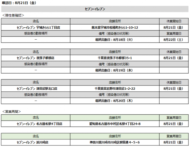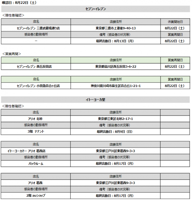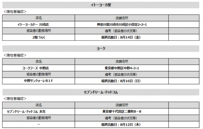 8月21日(金)に陽性者が確認されたのは、セブン‐イレブン宇城きらら1丁目店(熊本県宇城市松橋町きらら1‐10‐12)、セブン‐イレブン我孫子都部店(千葉県我孫子市都部35‐1)、セブン‐イレブン津田沼駅北口店(千葉県習志野市津田沼1‐2‐22)の3店舗。そして(株)イトーヨーカ堂運営のイトーヨーカドー川崎店(神奈川県川崎市川崎区小田栄2‐2‐1)、(株)ヨーク運営のヨークフーズ中野店(東京都中野区中野4‐3‐1 中野サンクォーレB1F)、(株)セブンドリーム・ドットコム本社(東京都千代田区二番町8-8)に勤務する従業員。