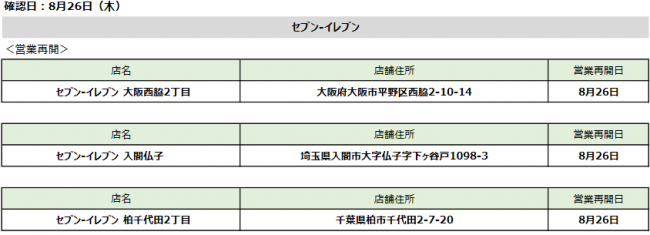流通スーパーニュース > 新型コロナ > セブン&アイnews|8/27感染発表、セブン-イレブン3店舗 セブン&アイnews|8/27感染発表、セブン-イレブン3店舗 新型コロナ / 2020年08月27日 ツイート (株)セブン&アイ・ホールディングス(東京都千代田区、井阪隆一社長)が8月27日(木)に発表した新型コロナウイルス感染発生のグループ企業店舗は、セブン-イレブン3店舗だけだった。 セブン‐イレブン大阪西脇2丁目(大阪府大阪市平野区西脇2‐10‐14)、セブン‐イレブン入間仏子(埼玉県入間市大字仏子字下ヶ谷戸1098‐3)、セブン‐イレブン柏千代田2丁目)千葉県柏市千代田2‐7‐208)の3店舗で、26日(水)に確認されている。 ツイート