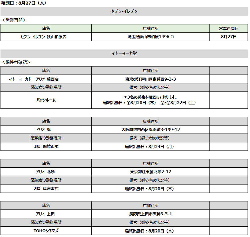 (株)セブン&アイ・ホールディングス(東京都千代田区、井阪隆一社長)は8月28日(金)、新型コロナウイルス感染発生のグループ企業店舗を発表した。