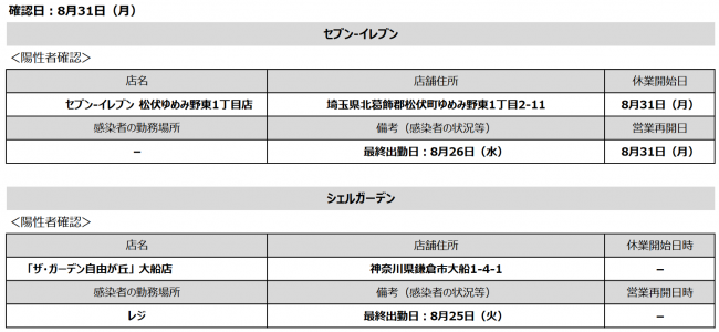 流通スーパーニュース > 新型コロナ > セブン&アイnews|9/1感染発表、セブン1名・ザ・ガーデン1名 セブン&アイnews|9/1感染発表、セブン1名・ザ・ガーデン1名 新型コロナ / 2020年09月01日 ツイート (株)セブン&アイ・ホールディングス(東京都千代田区、井阪隆一社長)は9月1日(火)、新型コロナウイルス感染が発生したグループ企業店舗を発表した。 セブン-イレブン松伏ゆめみ野東1丁目店(埼玉県北葛飾郡松伏町ゆめみ野東1丁目2‐11)と、「ザ・ガーデン自由が丘」大船店(神奈川県鎌倉市大船1‐4‐1)の2店舗。 ツイート