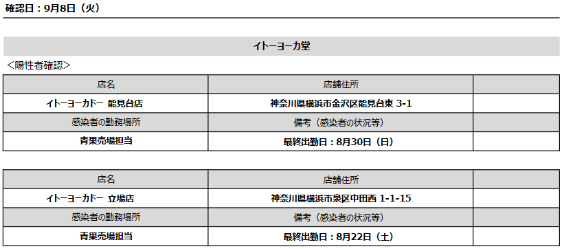 流通スーパーニュース > 新型コロナ > セブン&アイnews|9/9感染発表、イトーヨーカドー立場店と能見台店 セブン&アイnews|9/9感染発表、イトーヨーカドー立場店と能見台店 新型コロナ / 2020年09月10日 ツイート (株)セブン&アイ・ホールディングス(東京都千代田区、井阪隆一社長)は9月9日(水)、新型コロナウイルス感染者が発生したグループ企業店舗を発表した。 9月8日(火)に陽性者が確認された店舗は、イトーヨーカドー能見台店(神奈川県横浜市金沢区能見台東 3-1)とイトーヨーカドー立場店(神奈川県横浜市泉区中田西 1-1-15)の2店舗だった。 ツイート