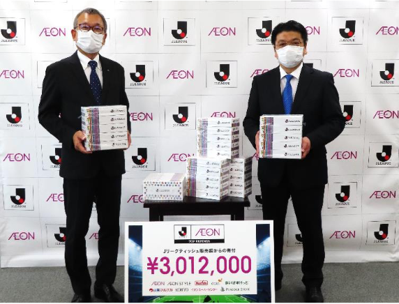(株)イオン(千葉市美浜区、吉田昭夫社長)は9月11日(金)、公益社団法人日本プロサッカーリーグ(Jリーグ)に、7月24日から全国のイオングループ約2500店舗で販売している「Jリーグティッシュ」の売上金の一部である、301万2000円を贈呈した。