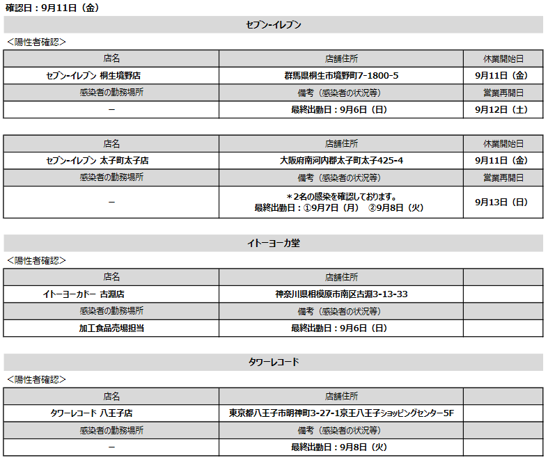 9月11日(金)は、セブン-イレブン桐生境野店(群馬県桐生市境野町7ー1800ー5)、セブン-イレブン太子町太子店(大阪府南河内郡太子町太子425‐4)のセブン-イレブン2店舗の従業員が感染。太子町太子店では2名の感染が確認されている。