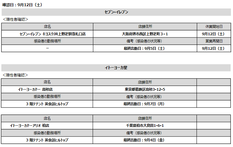 9月12日(土)は、セブン-イレブンキヨスクJR上野芝駅改札口店(大阪府堺市西区上野芝町3‐1)と、イトーヨーカドー高砂店(東京都葛飾区)、イトーヨーカドーアリオ柏店(千葉県柏市)の3店舗で感染者が発生した。