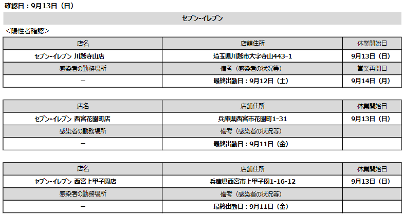 9月13日(日)は、セブン-イレブン川越寺山店(埼玉県川越市大字寺山443ー1)、セブン-イレブン西宮花園町店(兵庫県西宮市花園町1ー31)、セブン-イレブン西宮上甲子園店(兵庫県西宮市上甲子園1‐16‐12)の3店舗で感染者が発生したことを確認した。