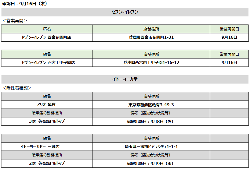 流通スーパーニュース > 新型コロナ > セブン&アイnews|9/17感染者発生、アリオ亀有とイトーヨーカドー三郷店 セブン&アイnews|9/17感染者発生、アリオ亀有とイトーヨーカドー三郷店 新型コロナ / 2020年09月17日 ツイート (株)セブン&アイ・ホールディングス(東京都千代田区、井阪隆一社長)が9月17日(木)、新型コロナウイルス感染者発生店舗を発表した。 9月16日(水)に陽性者が確認されたのは、(株)イトーヨーカ堂運営のアリオ亀有(東京都葛飾区亀有3‐49‐3)とイトーヨーカドー三郷店(埼玉県三郷市ピアラシティ1‐1‐1)の2店舗。 また、セブン-イレブン2店舗が営業を再開している。 ツイート