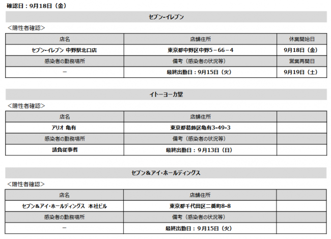 9月18日(金)に陽性者が確認されたのは、セブン-イレブン中野駅北口店(東京都中野区中野5-66-4)、イトーヨーカ堂アリオ亀有(東京都葛飾区亀有3-49-3)の2店舗と、セブン&アイ・ホールディングス本社ビル(東京都千代田区二番町8-8)。