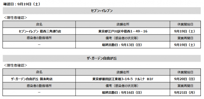 9月19日(土)に陽性者が確認されたのは、セブン-イレブン葛西三角東京都江戸川区中葛西1-49-16)、ザ・ガーデン自由が丘錦糸町店(東京都墨田区江東橋3-14-5テルミナB1F)の2店舗。