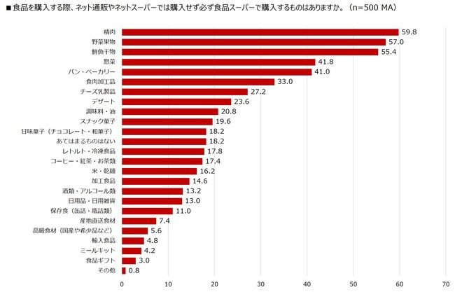 次に、ネットではなく直接食品スーパーで購入する商品では「精肉(59.8%)」「野菜・果物(57.0%)」「鮮魚・干物(55.4%)」などの生鮮食材や「惣菜(41.8%)」が選ばれ、鮮度が関係する食材については、特に直接自分の目で確認することが重要視される傾向にある。