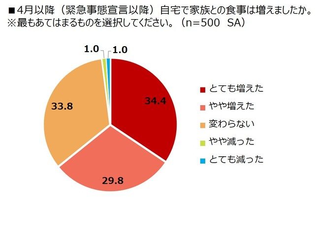 自宅での食事が増えたと回答したのは64.2%、コロナ終息後も自宅での食事が増えると回答したのは45.8%という結果になった。