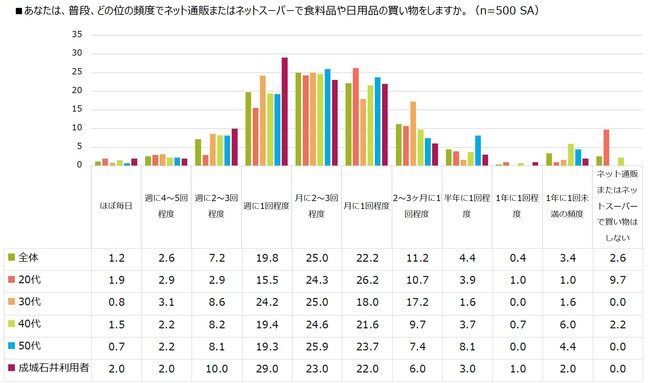 ネット通販やネットスーパーにおける日用品や食品の購入頻度を調査した結果、78%が月に1回以上利用していることがわかった。また20代~50代の各世代が、日常的にネットショッピングを取り入れている。